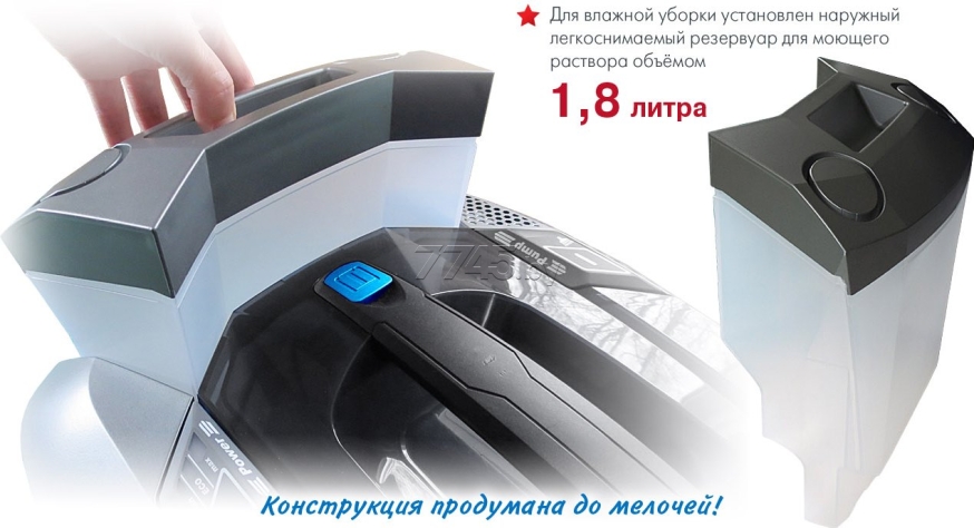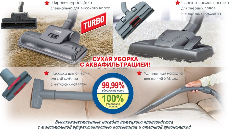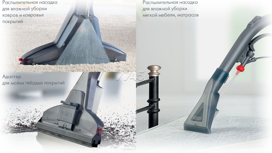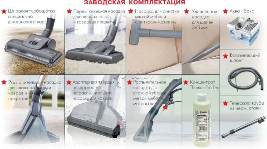 Моющая насадка одновременно разбрызгивает чистую воду, отмывает поверхность и высушивает ее. Насадка для влажной уборки обивки мягкой мебели очищает ворс от пыли и помогает ликвидировать пятна. Особенно актуальна для аллергиков и для семей с маленькими детьми. Эта насадка также хорошо отмывает пятна с ковров и паласов. Даже такой сложный для уборки мусор, как шерсть, пух или длинные человеческие волосы, теперь легко собирается турбощеткой Thomas. Валик турбощетки вращается с огромной скоростью, и его щетинки, расположенные по спирали, подцепляют и удаляют мусор с ворса ковра.