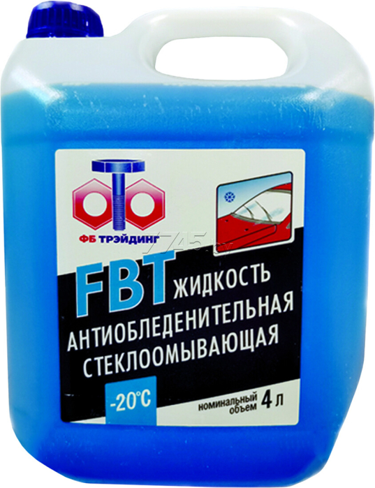 Жидкость антиобледенительная стеклоомывающая FBT – готовая для использования жидкость с гарантированной температурой незамерзания. Незамерзающая жидкость, готовая до -20С. Она также может применяться для веерных форсунок стеклоомывателя, подходит для поликарбонатных стекол фар и имеет приятный запах. Очень удобна в применении, т. к. нет необходимости разбавлять продукт водой, а значит использовать бутылки или другую тару. Поставляется этот продукт в четырёхлитровых канистрах, для удобства пользования оснащённых специальным «носиком», предотвращающим пролив жидкости мимо бачка и обеспечивающим более точное попадание струи в горловину.