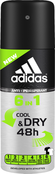 Антиперспирант аэрозольный ADIDAS Cool&Dry 6 в 1 150 мл (4000361724) для мужчин. Обеспечивает надежную защиту благодаря 6 активным действиям: против запаха, против пота, антибактериальный, экстрасвежесть, против белых следов, против желтых пятен. Сохраняет ощущение свежести на весь день.