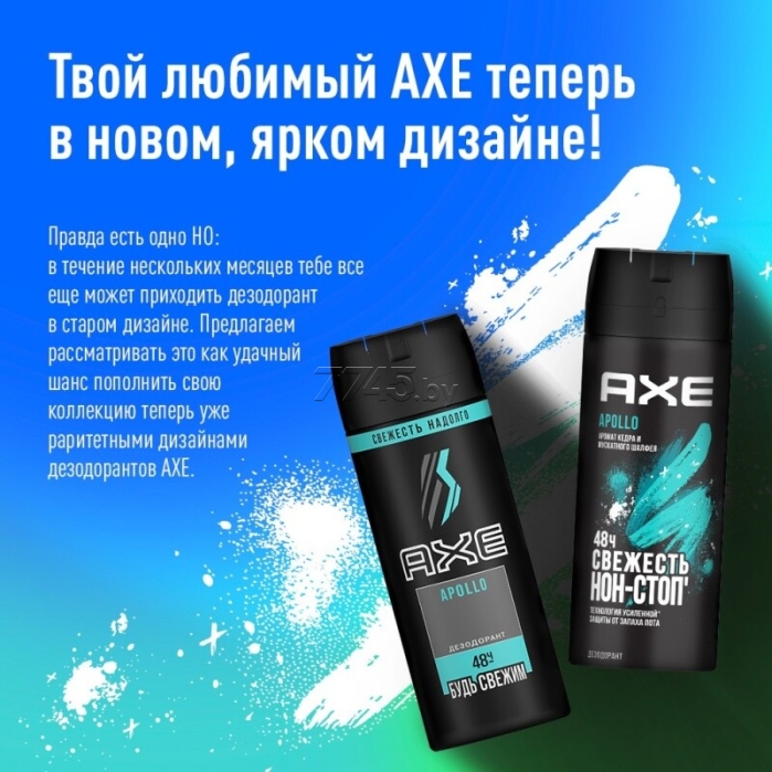 Средство наносится на кожу тонким слоем и эффективно нейтрализует неприятные запахи. При этом дезодорант AXE не блокирует работу потовых желез. Ощущение свежести останется с тобой надолго, даже если ты много времени провел в дороге или только что вернулся с тренировки. Дезодорант APOLLO придает уверенность в себе на 48 часов, каждый день и в любой ситуации независимо от уровня твоей активности!