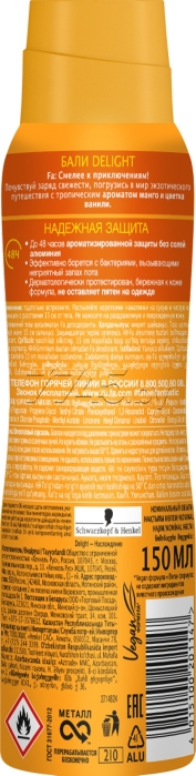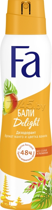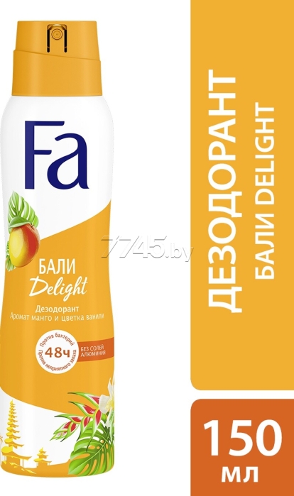 Дезодорант аэрозольный FA Ритмы острова Bali Kiss 150 мл (4015100201147) – это мягкий ритм дзен-релакса и невероятной тропической природы, ароматы манго и цветка ванили вдохновляют ритмами лета в любое время года, создавая ритм прекрасной жизни и отличного настроения. Почувствуй долговременную защиту и свежесть 48 ч без солей алюминия с новой технологией Power Scent. Ласковый к коже. Не оставляет пятен. Дерматологически протестирован.