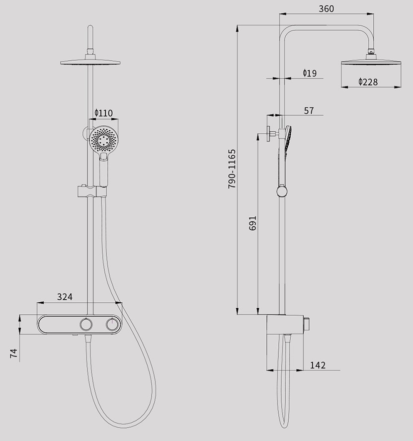 Комплектацияручной душ (душевая лейка)верхний душ (тропический)смесительстойка / штангадушевой шлангкрепление ручного душаполка / в виде верхней части смесителя /