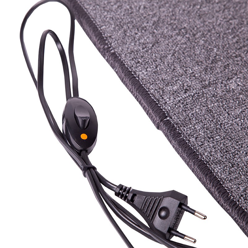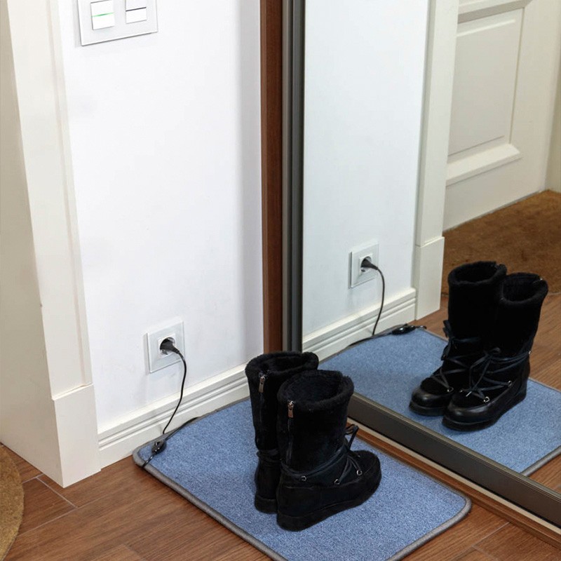 Коврик подогревается изнутри тонким нагревательным проводом. Поверхность греющего коврика выполнена из ковролина. Температурный режим обогрева подобран таким образом, чтобы создать комфортное ощущение тепла, а также обеспечить бережную сушку обуви.