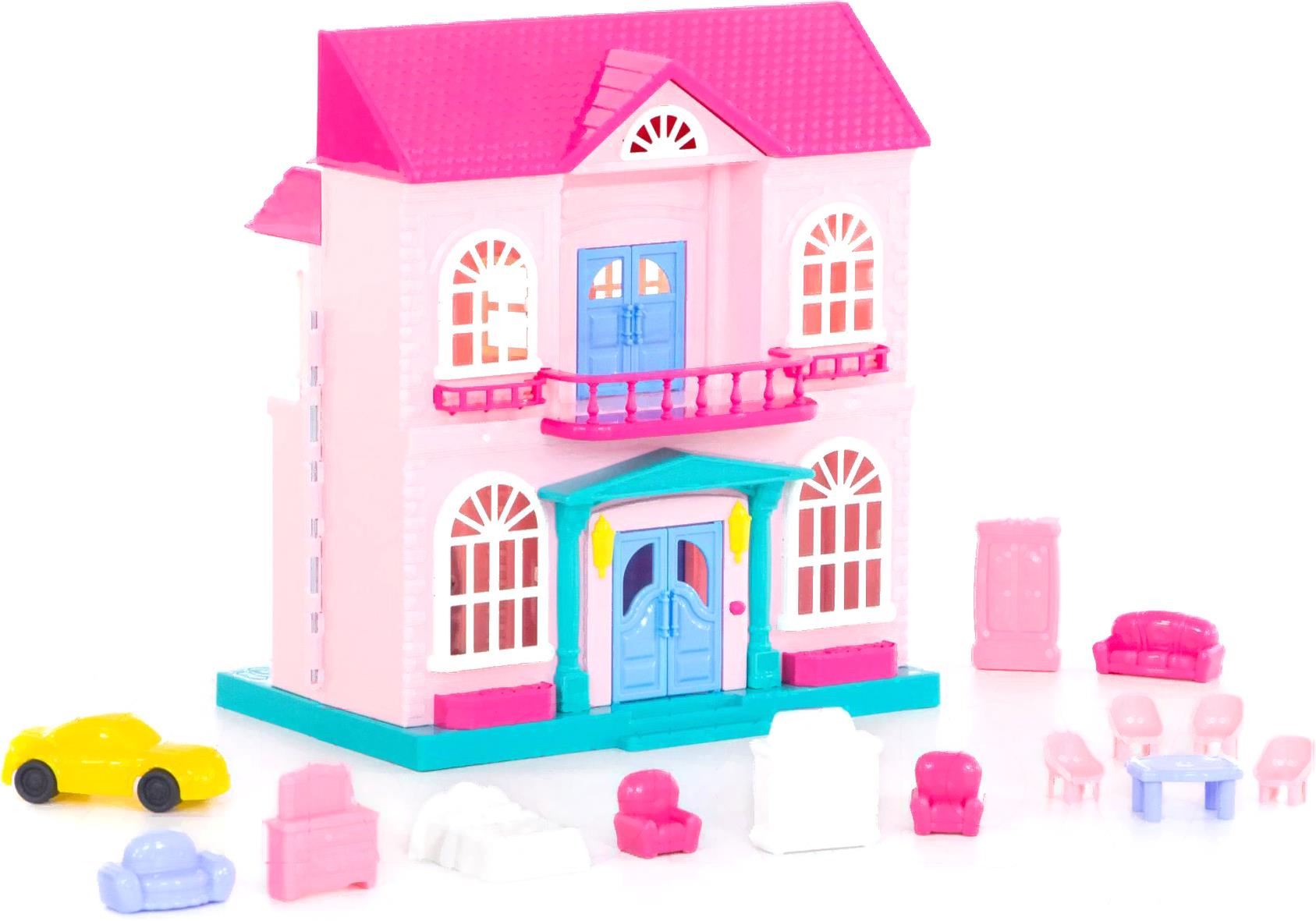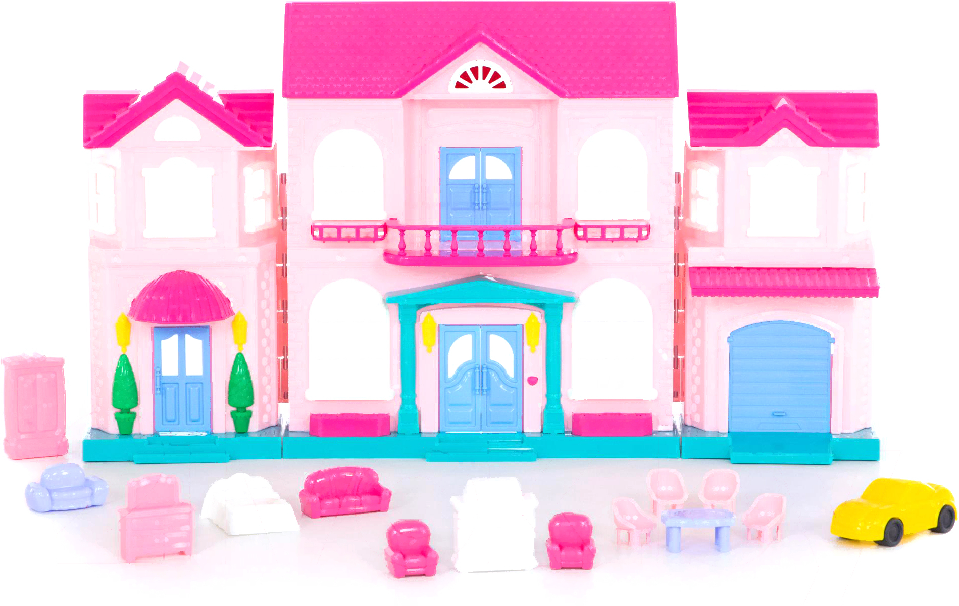 • Комплектация кукольного домика кровать, обеденный стол, стул (4), шкаф, кресло (2), диван (2), камин, туалетный столик, транспорт