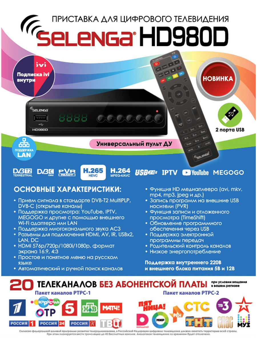 Цифровая приставка Selenga HD980D DVB-T2/C (H.265, LAN)