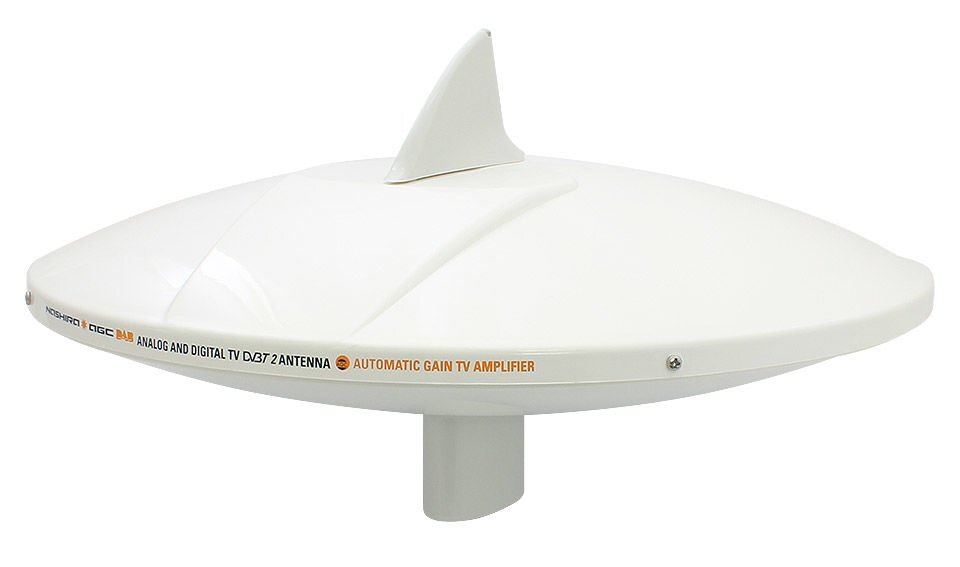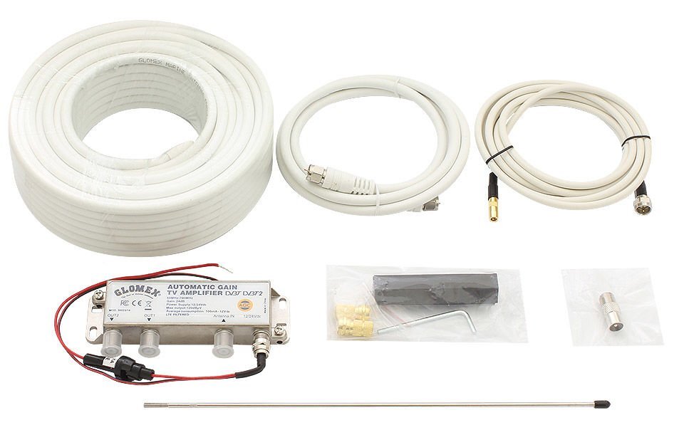 - Описание Компактная TV/AM/FM антенна с усилителем и 16-метровым кабелем. Водонепроницаемый корпус.Степень усиления сигнала: 26 Дб.Диапазоны частот: 40/108-170/800 МГц.Размеры: 370x185 мм.Вес: 800 г.Напряжение питания: 12 В.Потребляемый ток: 20 мА.Производитель: «Glomex», Италия.