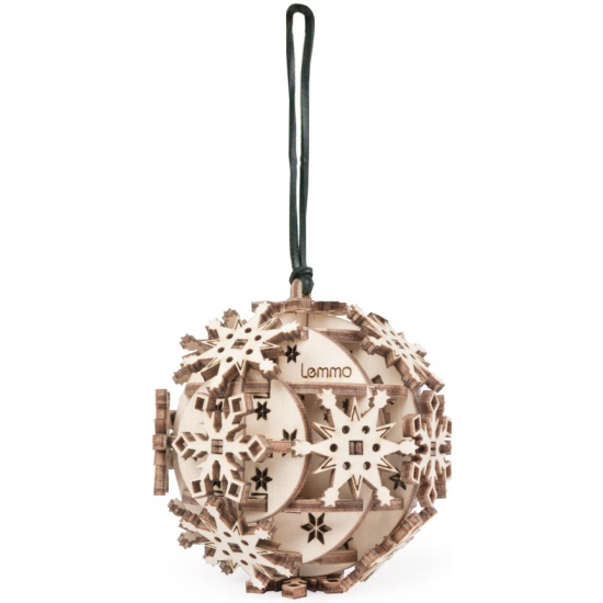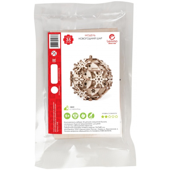 Сборная модель LEMMO 01-82 Новогодний шарДеревянный конструктор и набор для творчества из дерева «Новогодний Шар» от фабрики деревянной игрушки «Леммо» для детей и взрослых. Все детали выполнены из качественной древесины и имеют сильный насыщенный запах дерева.Особенности:Можно использовать как елочное украшениеЕсть подвес для лентыЛегкая сборка без клея Любой набор для творчества, заготовку для поделки из фанеры можно раскрасить красками, карандашами или фломастерами. Лучше всего подходят акриловые краски.Возраст: от 5 лет.Кол-во деталей: 35 шт.Размеры: 75x75x80 мм.
