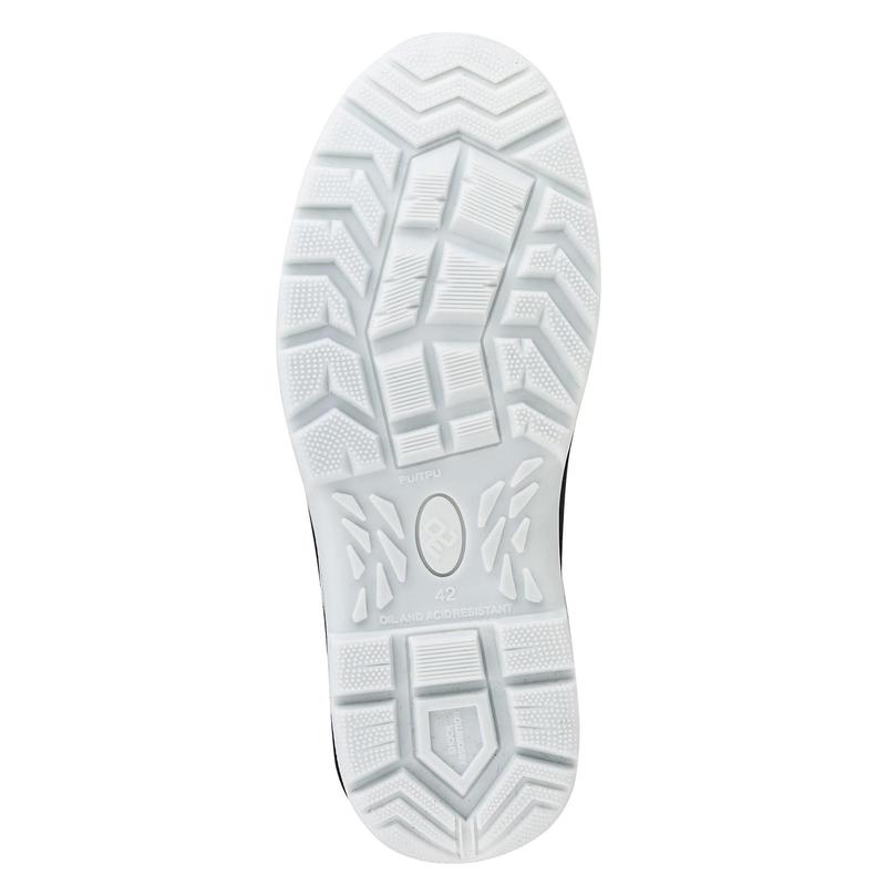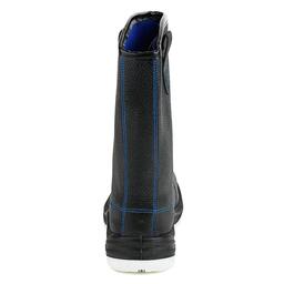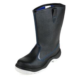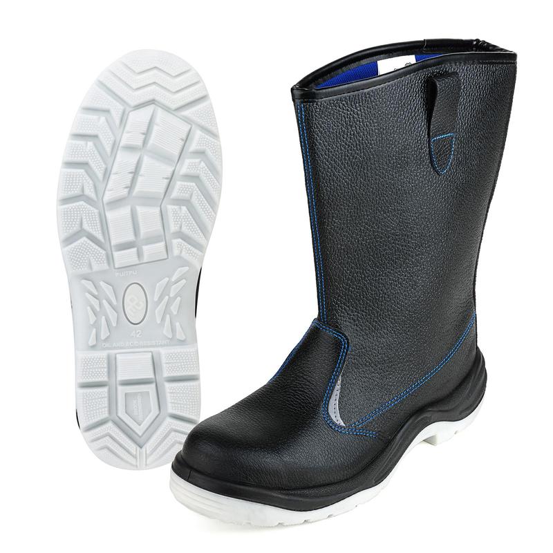 Сапоги изготовлены методом литья промежуточного слоя подошвы из полиуретана к заготовке верха обуви. На промежуточный слой из полиуретана прилит ходовой слой из термопластичного полиуретана (температурный режим от -40°С до 120°С) со стойкостью к деформациям и истиранию. Имеется пристроченный прилитый задний наружный ремень. Cапоги изготовлены из искусственной кожи. По верху выполнен мягкий кант. Подкладка из материала на нетканой основе с высокими показателями гигроскопичности CAMBRELLE, стойкого к истиранию. Стелька вкладная. С внешних сторон в верхней части голенища выполнены петли для удобства надевания. Голенище имеет высоту 30 см. В носочной части внутренний защитный подносок из металла ударной прочностью 200 Дж. В передней части имеются фигурные световозвращающие элементы. Выполнена контрастная отстрочка в тон подкладки. Подошва двухслойная (ПУ/ТПУ), МБС. Есть внутренняя амортизирующая вставка в пяточной части подошвы. Глубина профиля ходового слоя подошвы составляет 3,5 мм. Цвет сапог черный.