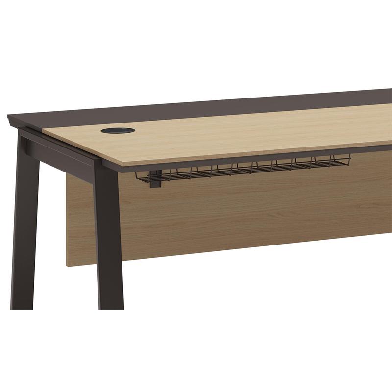 Стол прямой. Столешница выполнена в виде «пирога», состоит из двух частей сверху ДСП 10 мм, внутри — МДФ 19 мм облицована пленкой методом вакуумного прессования. Крышка врезана в опору. В столешницу врезан круглый проводник черного цвета. Кабельный впуск 80×13 мм. Опора частично выступает над крышкой. Сечение трубы металла 60×20 мм. Под столешницей одна металлическая траверса для усиления жесткости конструкции. Стол укомплектован сетчатым лотком для проводов.Изображения товаров на сайте не могут гарантировать точную цветопередачу.