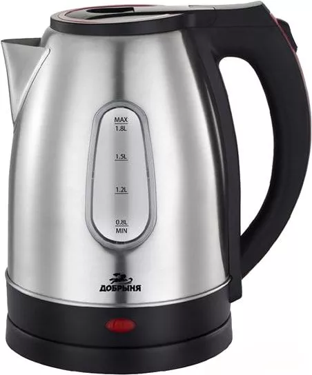Электрический чайник, мощность 2200 Вт, объем 1.8 л, материал корпуса металл/пластик, нагревательный элемент закрытая спираль, дополнительные функции: индикация включения, подставка с вращением на 360°.