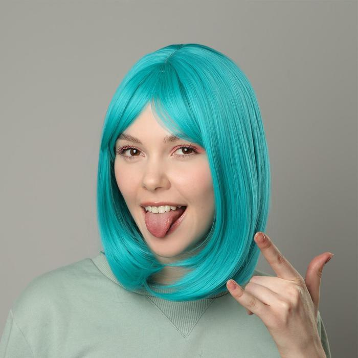 Парик искусственный с чёлкой/ парик 30 см/ парик бирюзовый/ парик голубой/ каре