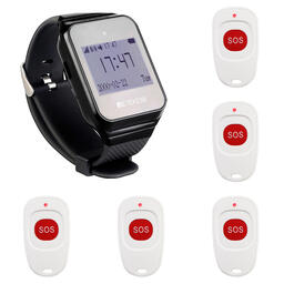 Кнопки вызова персонала и часы пейджер. Система вызова из часов и 5-ти кнопок SWB06-1. Радиус 150 м. Степень защиты IP55