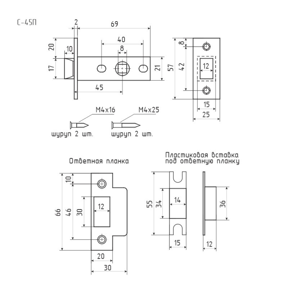 Защелка дверная Нора-М С-45П с пластиковым ригелем - Матовый никель