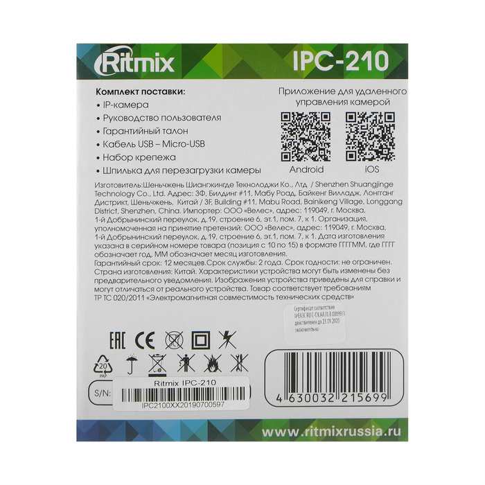 Видеокамера поворотная Ritmix IPC-210, IP, 2Мп, 1080p, Wi-Fi, датчик движ, слот д/SD карты RITMIX Life 4719643