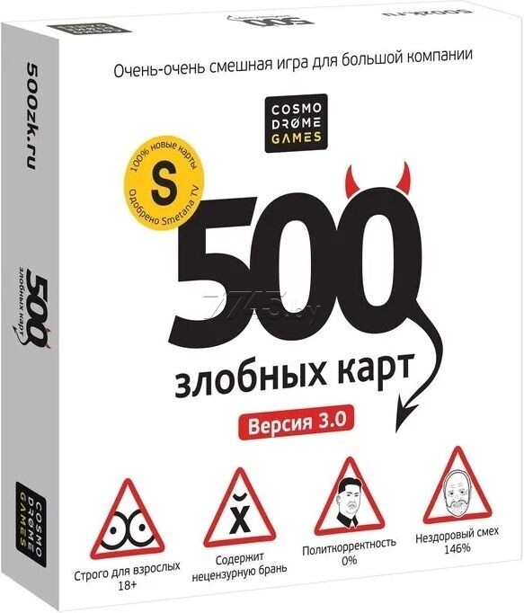 Игра настольная COSMODROME GAMES 500 злобных карт версия 3.0 (52060) — это игра с пошлым провокационным юмором и нецензурной лексикой. В коробке находятся 500 карточек: прикольные заходы и забавные варианты ответов. В выпуске 3.0 — новые злобные карточки. Авторы взяли свежие трешовые темы и прокатились на популярных мемах. Ведущий (а им становятся все игроки по очереди) зачитывает с красной карточки фразу с пропуском. Например: "_____ помогает мне защищаться от хулиганов" или "На Луне можно найти две вещи: мячики для гольфа и _____". А все остальные игроки стараются выбрать из своих белых карточек ту, фраза на которой лучше всего подойдет под запросы ведущего. Белые карточки выкладываются так, чтобы ведущий не знал, где чья. Теперь его задача — зачитать все варианты, отсмеяться и выбрать самый лучший — то есть решить, кто из игроков получит очки, а кто нет. Правила можно объяснить за полминуты — и их поймут все. Игра отлично подходит большим компаниям, в которых все люди хорошо знакомы друг с другом и не стесняются пошло шутить.