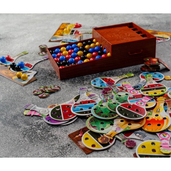 «Лаборатория» — это отечественная вариация итальянской игры Potion Explosion, получившей награду «Лучшая игра года. В новой версии игры картонный диспенсер заменен на пластиковый! Игрокам нужно забирать цветные шарики из общего диспенсера так, чтобы «сварить» из них сильные зелья. Готовое зелье приносит очки победы и дает различные волшебные эффекты!