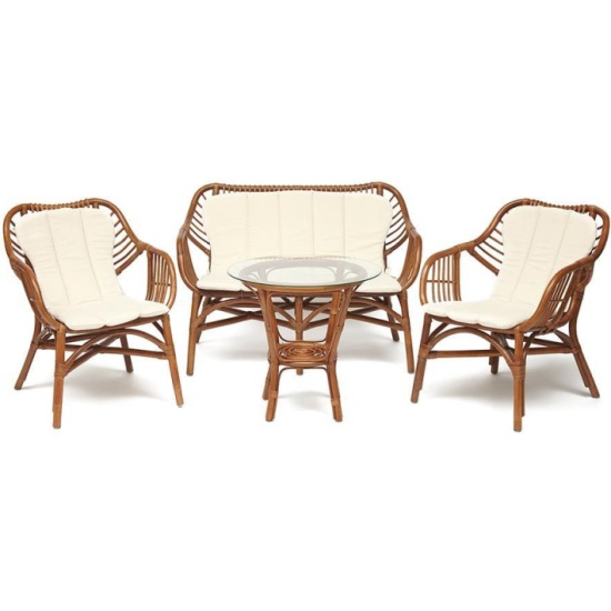 В комплекте: стол круглый + 2 кресла + диван Данная модель обладает высокой прочностью и устойчива к выцветанию, гниению и царапинам, что обеспечивает длительный эксплуатационный срок.Сорт ротанга: высший. Поставляется в собранном виде.