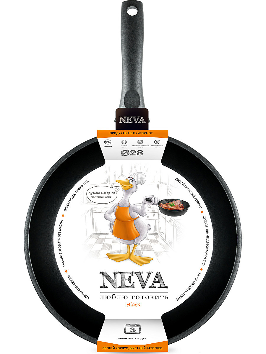 Сковорода NEVA глубокая толстостенная, с антипригарным покрытием, можно мыть в посудомоечной машине, 28 см