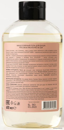 - Состав Oryza Sativa (Rice) Extract (экстракт Риса), Moringa Oleifera (Moringa Tree) Leaf Extract (экстракт Моринги), Sodium Coco-Sulfate, Betaine natural extract (экстракт сахарной Свеклы), Cocamidopropyl Betaine, Sodium Cocoamphoacetate, Vegetable Glycerin (растительного происхождения), Niacinamide (витамин В3), Calcium Pantothenate (витамин В5), Sodium Ascorbyl Phosphate (витамин С), Tocopheryl Acetate (витамин Е), Pyridoxine HCl (витамин В6), Shea Butter Ethyl Esters (из масла Ши), Sodium Chloride, Hydrolyzed Rice Protein (гидролизованные протеины Риса), Citric Acid, Maltodextrin, Sodium Starch Octenylsuccinate, Silica, Propanediol, Sorbic Acid, Croton Lechleri Resin Extract T (Dragon's Blood сок дерева Кротон Лехлера), Parfum, Benzyl Alcohol, Benzoic Acid, Dehydroacetic Acid, Potassium Sorbate, Sodium Benzoate