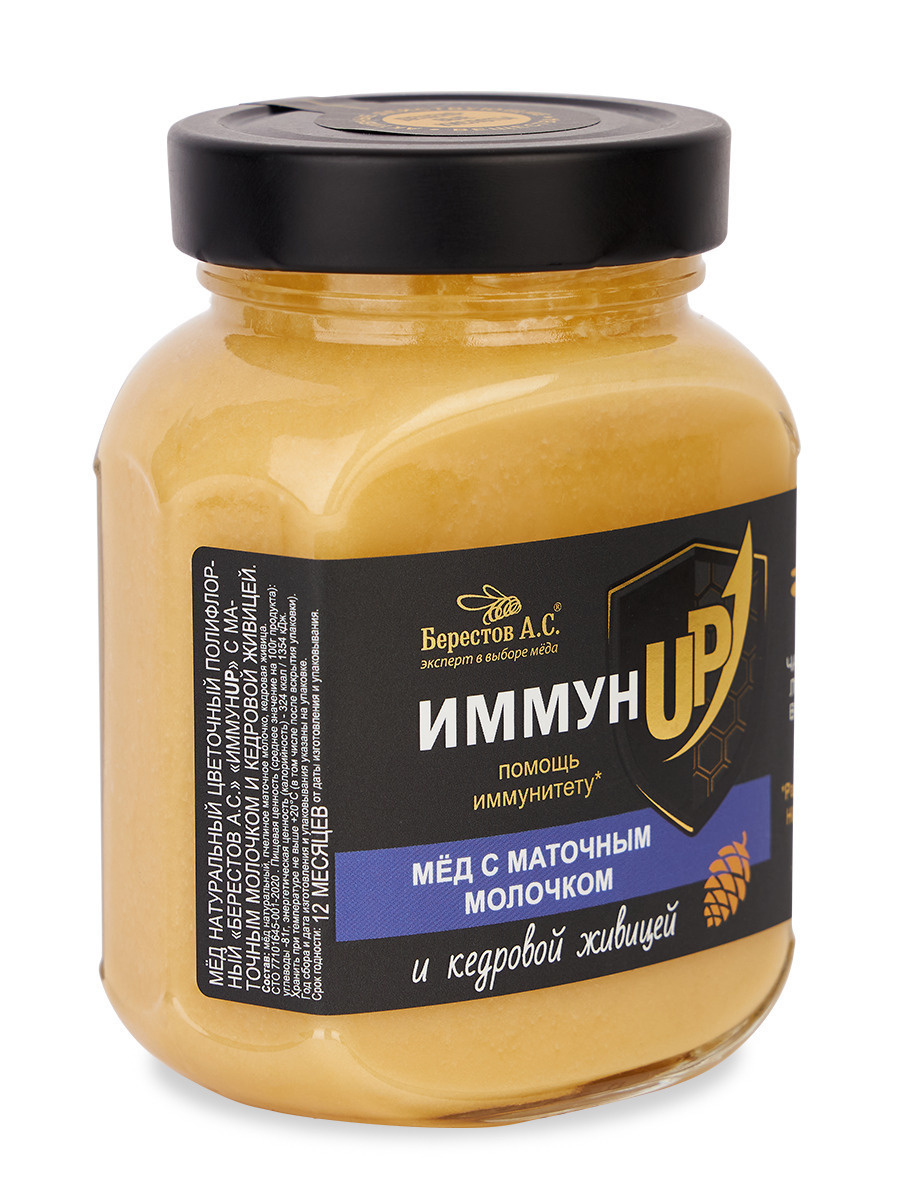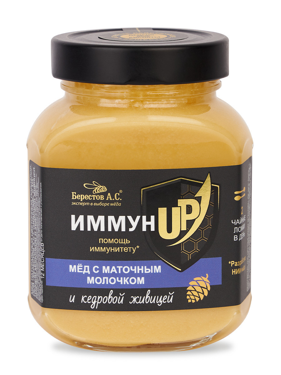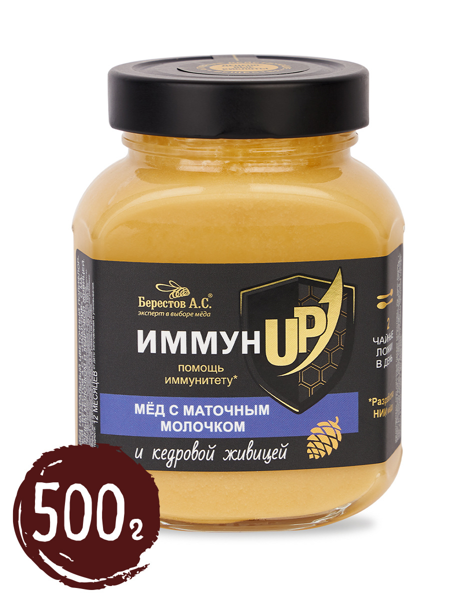 Мёд "ИммунUP" с МАТОЧНЫМ МОЛОЧКОМ и кедровой живицей, Берестов А.С., 500 г, здоровье, укрепление иммунитета, ЗОЖ, иммунап