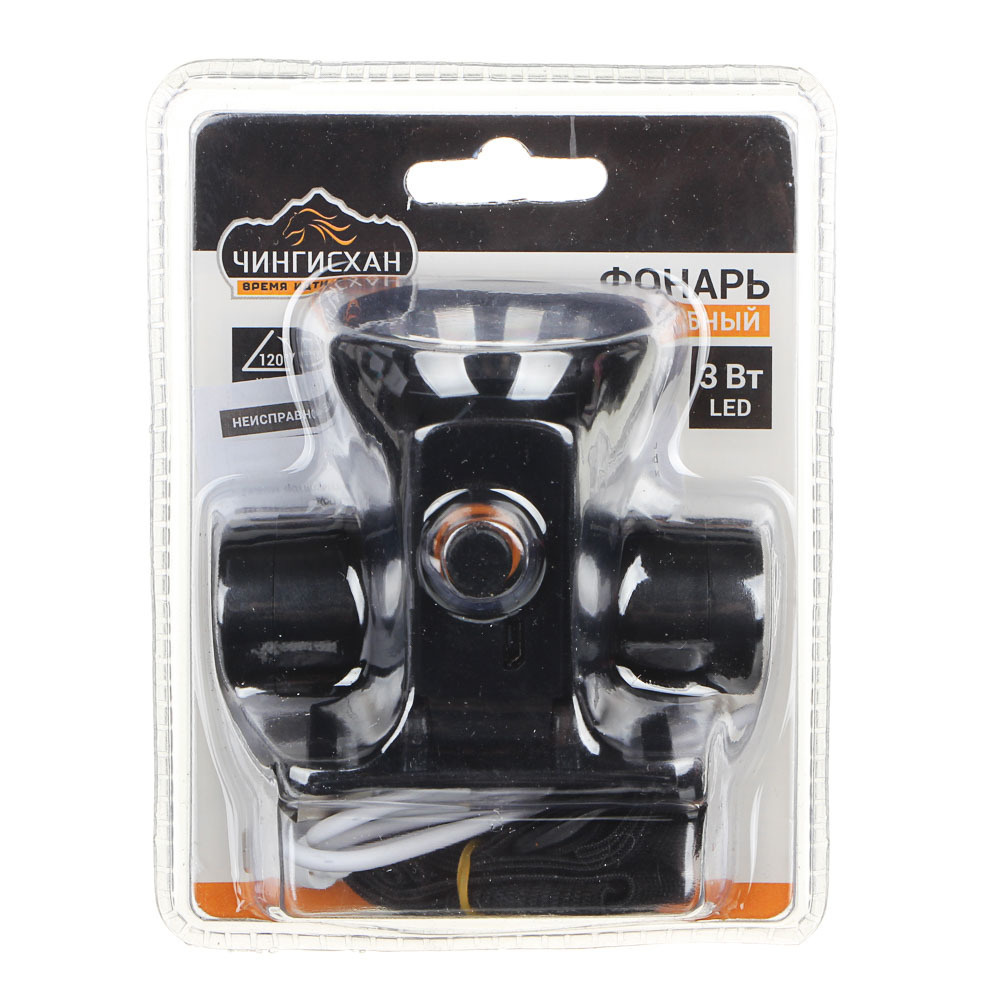 Фонарь налобный, 1 LED, 3 Вт, аккумулятор 1200мАч, 7х8см, 2 режима, USB кабель