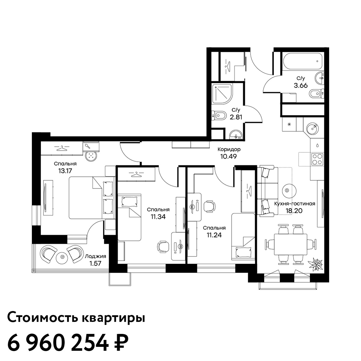 • Стоимость квартиры 6 960 254 руб (96 030 руб/м2)