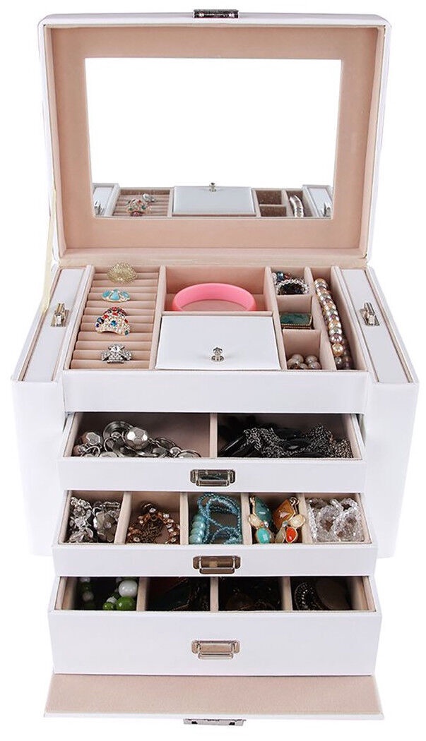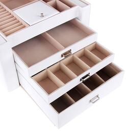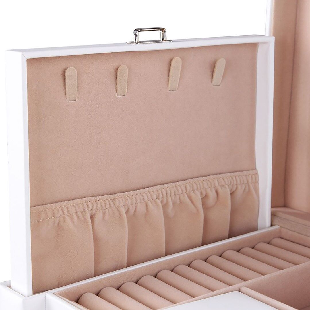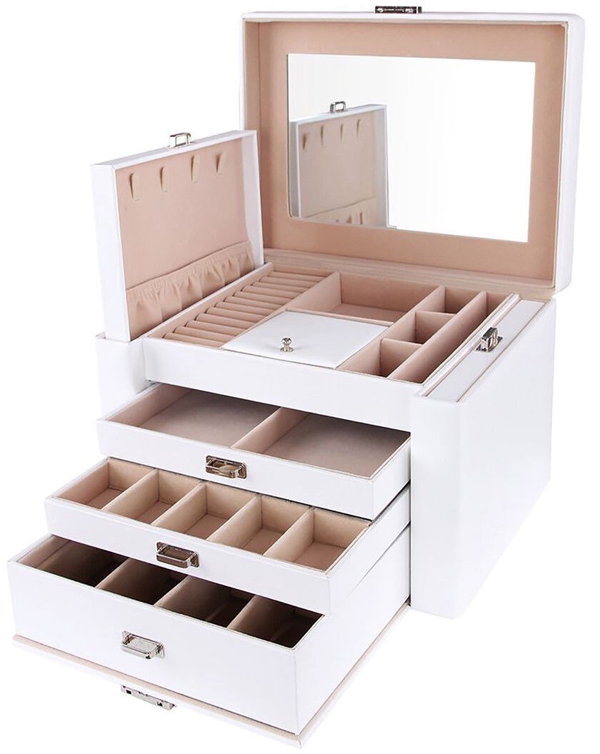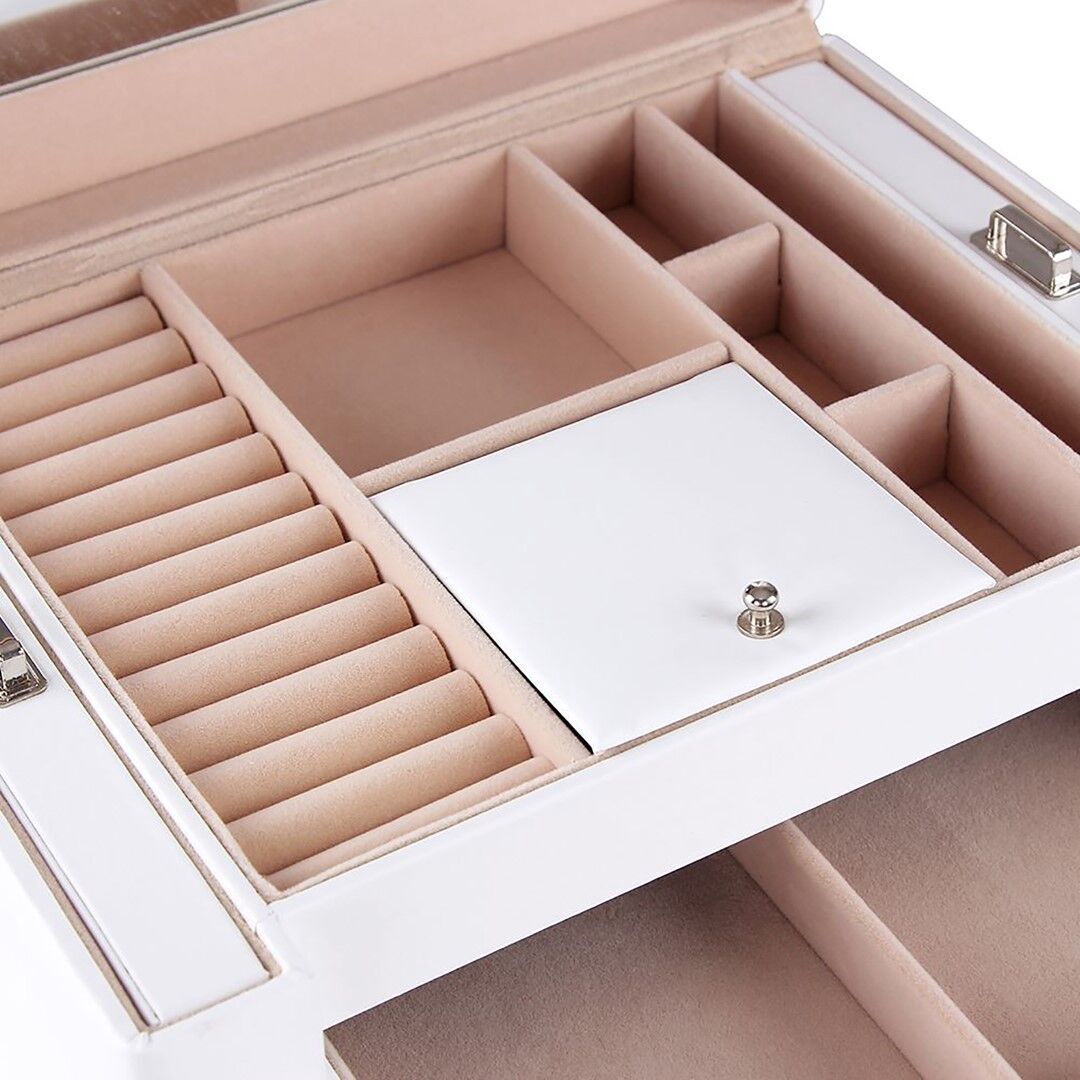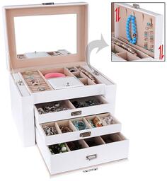 Papildoma informacijaIlgis: 21,8 cm. Vidinė spalva: Smėlio. Vidinė medžiaga: Aksomas. Šonuose yra 2 stalčiai su kabliukais. Atskira vieta auskarams ir žiedams laikyti. Stalčiai idealiai tinka laikrodžiams laikyti