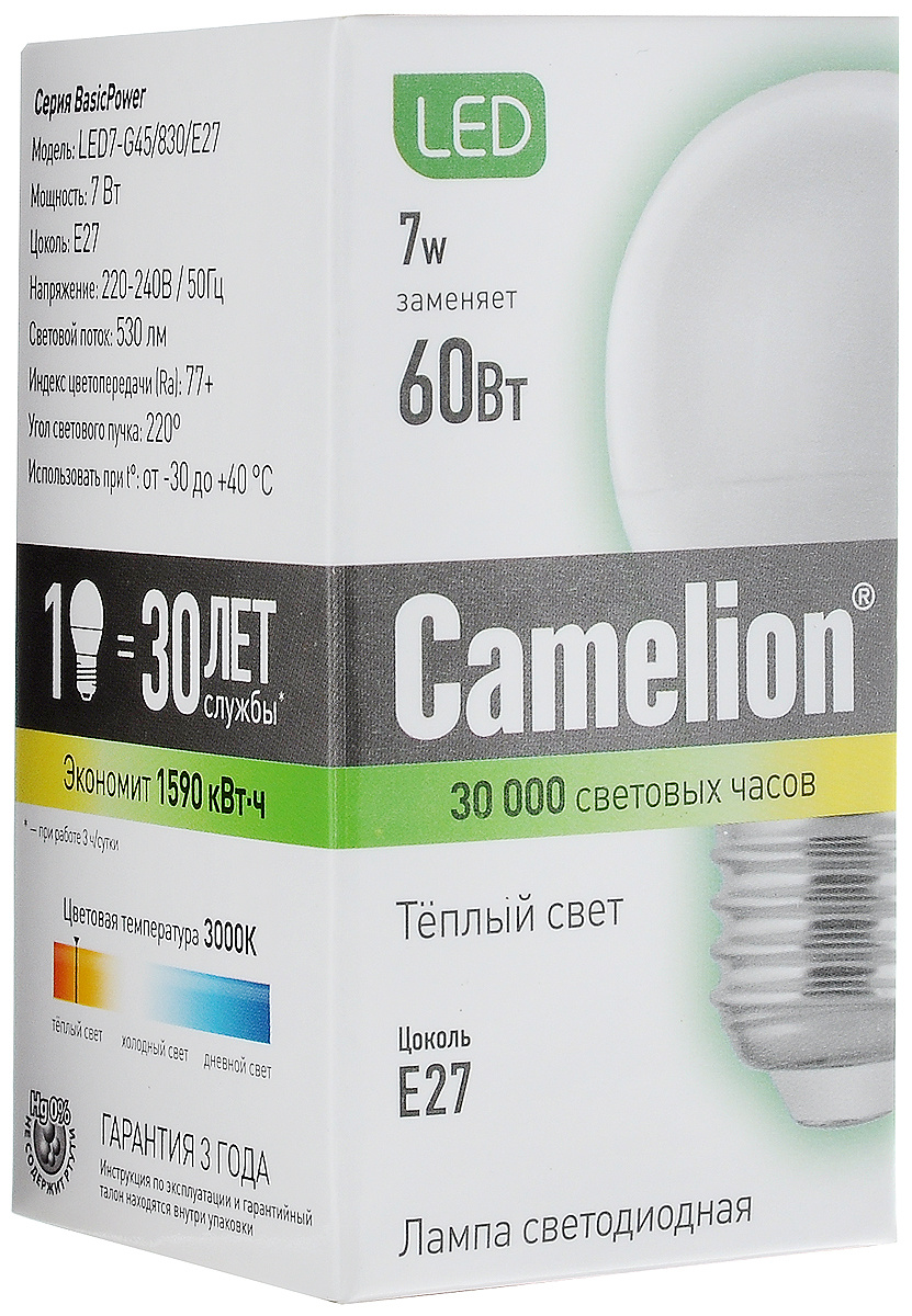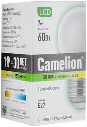 Лампочка Camelion LED7-G45/830/E27, Теплый свет 7 Вт, Светодиодная