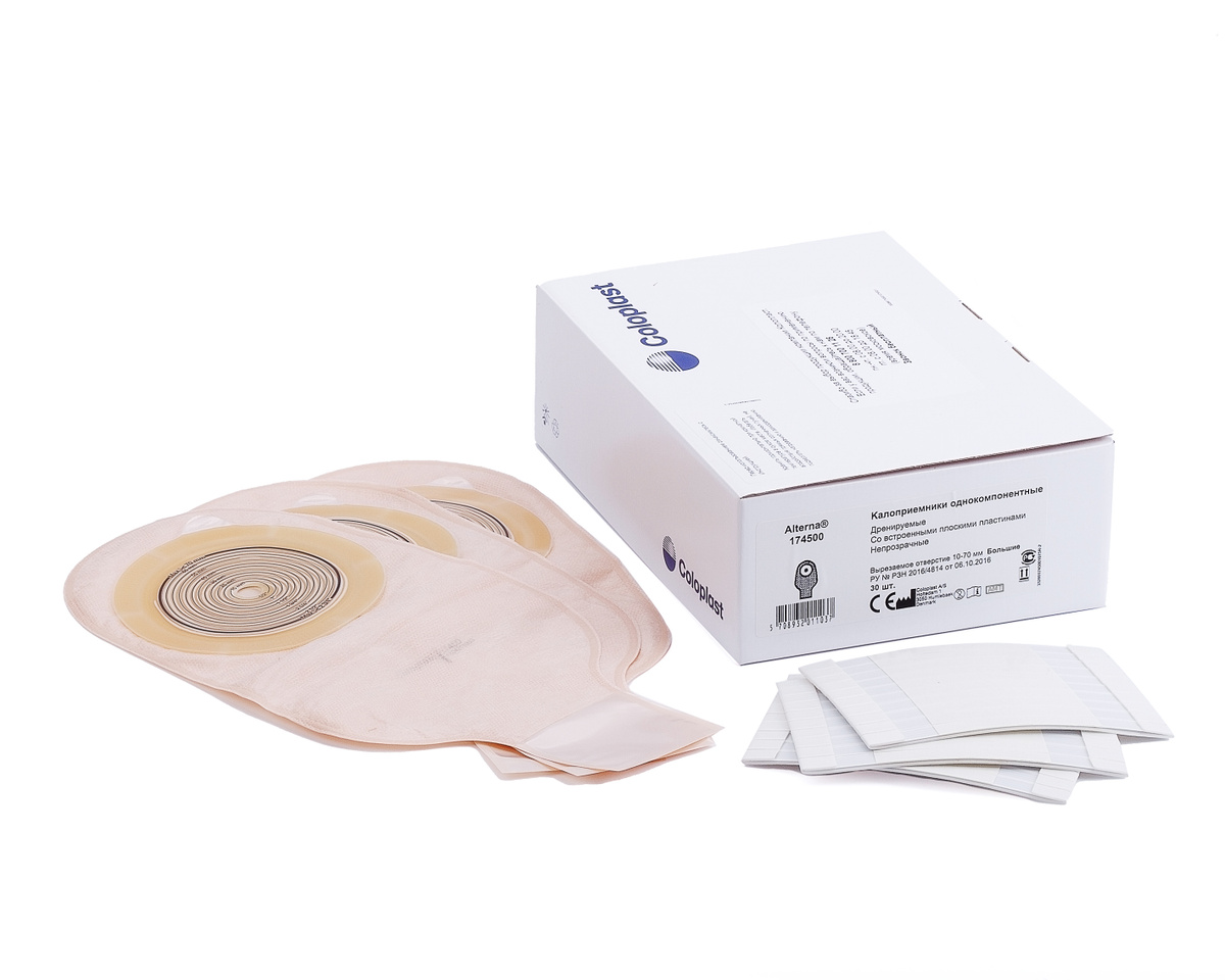 174500 Калоприемники Coloplast Alterna однокомпонентные дренируемые открытые со встроенными плоскими пластинами непрозрачные, вырезаемое отверстие 10-70мм, 10шт.