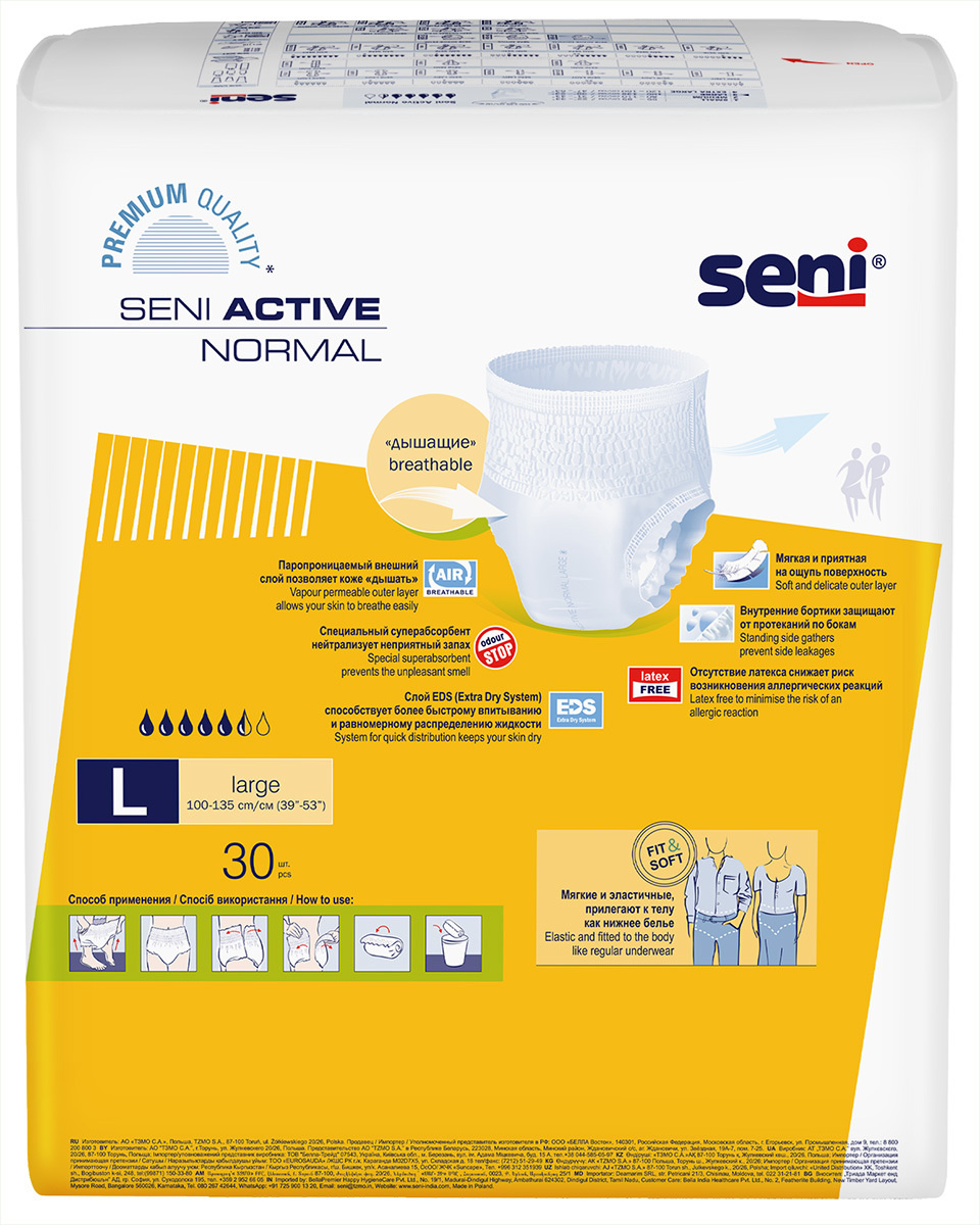 Трусы впитывающие для взрослых Seni ACTIVE NORMAL large по 30 шт., обхват 100-135 см.