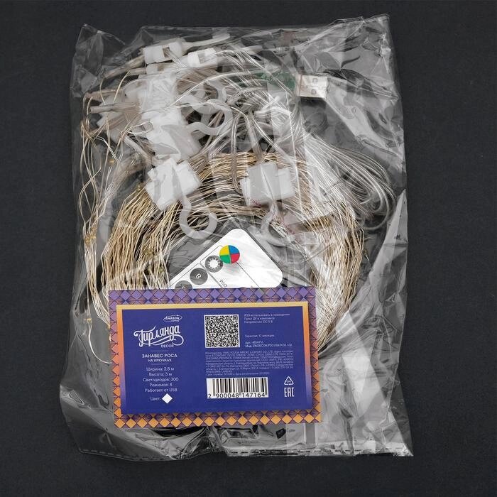Гирлянда "Занавес" 2.8 х 3 м , IP20, серебристая нить, 300 LED, свечение белое, 8 режимов, USB