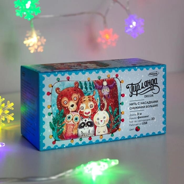 Гирлянда "Нить" 3 м с насадками "Снежинки большие", IP20, прозрачная нить, 20 LED, свечение RG/RB, мигание, USB