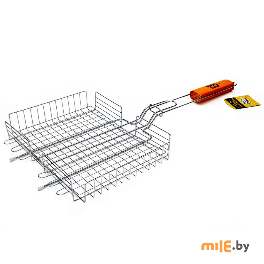 Глубокая решетка-гриль "RoyalGrill" изготовлена из высококачественной стали. На решетке удобно размещать стейки, ребрышки, гамбургеры, сосиски, рыбу, овощи.Решетка предназначена для приготовления пищи на углях. Блюда получаются сочными, ароматными, с аппетитной специфической корочкой. Рукоятка изделия оснащена деревянной вставкой и фиксирующей скобой, которая зажимает створки решетки. Размер рабочей поверхности решетки (без учета усиков): 28 х 22 см.