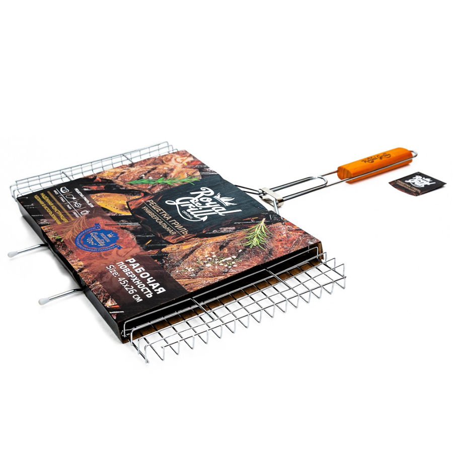 Решетка-гриль большая универсальная 45х26 см ROYALGRILL 80-024 изготовлена из высококачественной стали с коррозионностойким покрытием. На решетке удобно размещать стейки, ребрышки, гамбургеры, сосиски, рыбу, овощи. Решетка предназначена для приготовления пищи на углях. Блюда получаются сочными, ароматными, с аппетитной специфической корочкой. Рукоятка изделия оснащена деревянной вставкой и фиксирующей скобой, которая зажимает створки решетки.