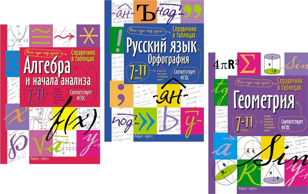 Справочник в таблицах. Алгебра и начала анализа. Русский язык. Орфография. Геометрия. 7-11 класс (комплект 3 книг)