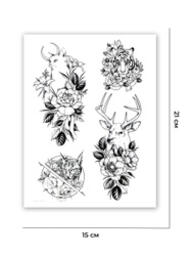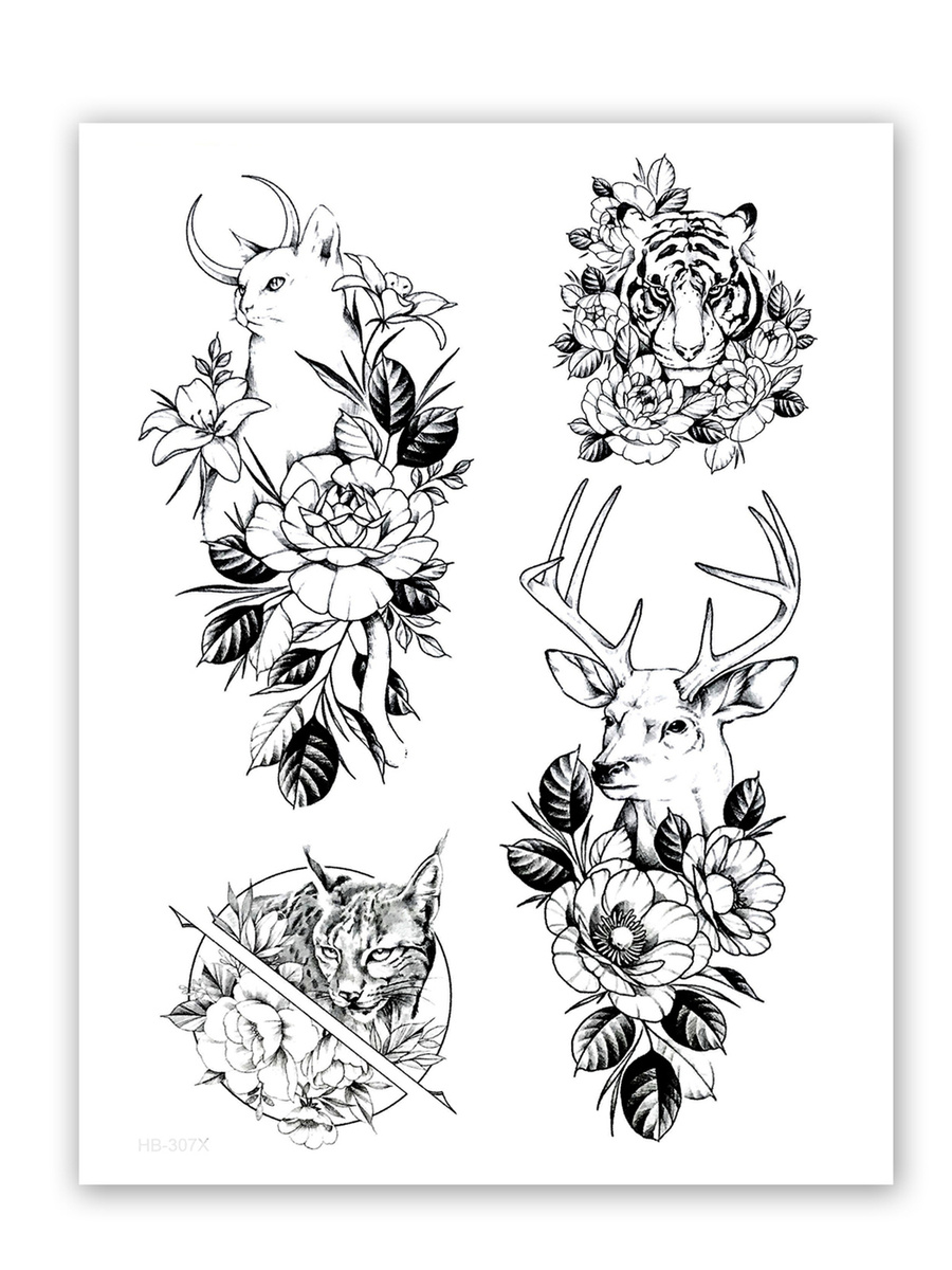 Boninio Tattoo / Временная переводная татуировка № 375 "Дикие кошки и олень" 21х15 см.