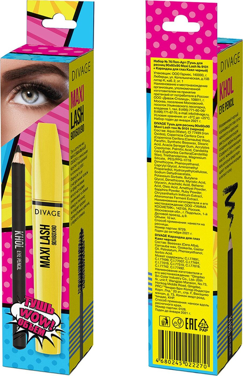 - Состав: Тушь: вода, карнаубский воск, парафин, синтетический пчелиный воск, стеариновая кислота, акриловый сополимер, смола сенегальской акации, пальмитиновая кислота, канделилльский воск, триэтаноламин, силикат магния, ПЭГ/ППГ-17/18 диметикон, феноксиэтанол, каприлил гликоль, аминометил пропандиол, гидроксиэтилцеллюлоза, дегидроацетат натрия, сорбат калия, диметикон, бутиленгликоль, глицерин, экстракт хризантемы, экстракт фермента алтеромонаса.|Может содержать: CI 77499, CI 77007, CI 77891, CI 75470, CI 77289, |CI 77288, масло семян подсолнечника, экстракт листьев алоэ, лецитин, токоферол, аскорбилпальмитат, токоферил ацетат, лимонная кислота, ВHA, BHT. Карандаш: ;Тушь: вода, карнаубский воск, парафин, синтетический пчелиный воск, стеариновая кислота, акриловый сополимер, смола сенегальской акации, пальмитиновая кислота, канделилльский воск, триэтаноламин, силикат магния, ПЭГ/ППГ-17/18 диметикон, феноксиэтанол, каприлил гликоль, аминометил пропандиол, гидроксиэтилцеллюлоза, дегидроацетат натрия, сорбат калия, диметикон, бутиленгликоль, глицерин, экстракт хризантемы, экстракт фермента алтеромонаса.|Может содержать: CI 77499, CI 77007, CI 77891, CI 75470, CI 77289, |CI 77288, масло семян подсолнечника, экстракт листьев алоэ, лецитин, токоферол, аскорбилпальмитат, токоферил ацетат, лимонная кислота, ВHA, BHT. Карандаш: Beeswax (Cera Alba), Carnauba wax, Ozokerite, Castor oil, Petrolatum, Phenoxyethanol, Sorbic Acid|Может содержать: CI 77891, CI 77491, CI77492, CI 77499, CI 77007, CI 77288, CI 77289, CI 77510, CI 16035:1, CI 15850:1, CI 15850, CI 15850:2, CI 77742, CI 77019, CI 16185:1.