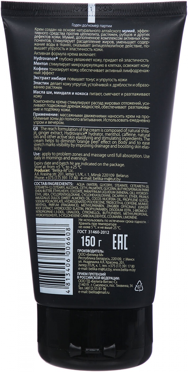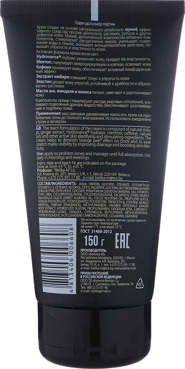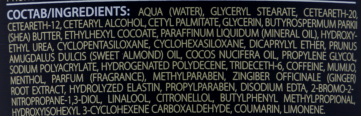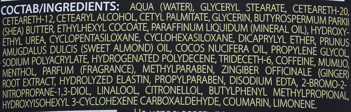 - Состав: AQUA (WATER), GLYCERYL STEARATE, CETEARETH-20, CETEARETH-12, CETEARYL ALCOHOL, CETYL PALMITATE, GLYCERIN, BUTYROSPERMUM PARKII (SHEA) BUTTER, ETHYLHEXYL COCOATE, PARAFFINUM LIQUIDUM (MINERAL OIL), HYDROXYETHYL UREA, CYCLOPENTASILOXANE, CYCLOHEXASILOXANE, DICAPRYLYL ETHER, PRUNUS AMUGDALUS DULCIS (SWEET ALMOND) OIL, COCOS NUCIFERA OIL, PROPYLENE GLYCOL, SODIUM POLYACRYLATE, HYDROGENATED POLYDECENE, TRIDECETH-6, COFFEINE, MUMIJO, MENTHOL, PARFUM (FRAGRANCE), METHYLPARABEN, ZINGIBER OFFICINALE (GINGER) ROOT EXTRACT, HYDROLYZED ELASTIN, PROPYLPARABEN, DISODIUM EDTA, 2-BROMO-2-NITROPROPANE-1, 3-DIOL, LINALOOL, CITRONELLOL, BUTYLPHENYL METHYLPROPIONAL, HYDROXYISOHEXYL 3-CYCLOHEXENE CARBOXALDEHYDE, COUMARIN, LIMONENE