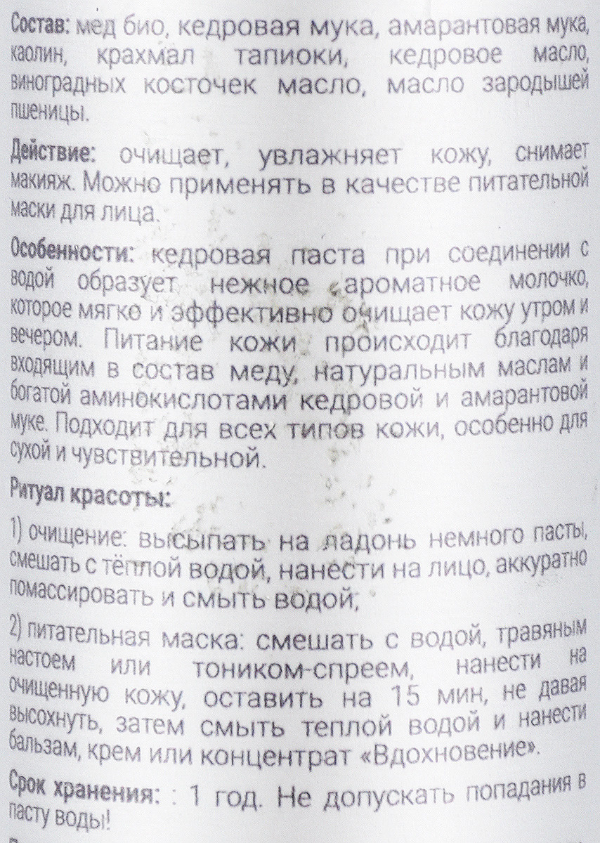 - Способ применения 1) очищение: высыпать на ладонь немного пасты, смешать с тёплой водой, нанести на лицо, аккуратно помассировать и смыть водой; 2) питательная маска: смешать с водой, травяным настоем или тоником-спреем, нанести на очищенную кожу, оставить на 15 мин, не давая высохнуть, затем смыть теплой водой и нанести бальзам, крем или концентрат «Вдохновение».