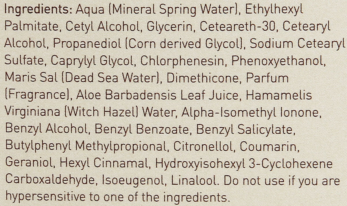 - Состав: Aqua (Mineral Spring Water), Ethylhexyl Palmitate, Cetyl Alcohol , | Glycerin, Ceteareth-30, Cetearyl Alcohol, Propanediol (Corn derived Glycol), Sodium Cetearyl Sulfate, Caprylyl Glycol, Chlorphenesin, Phenoxyethanol, Maris Aqua (Dead Sea Water), Dimethi