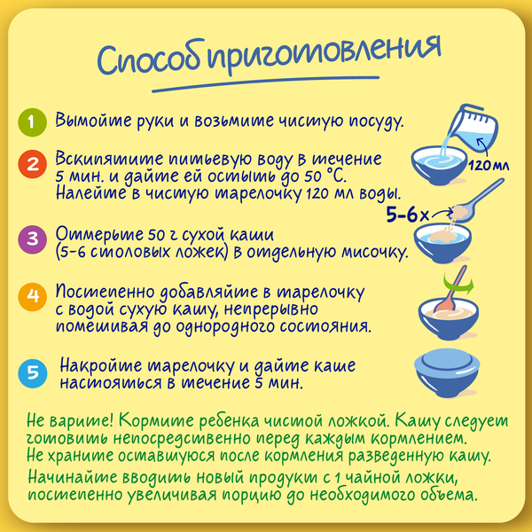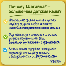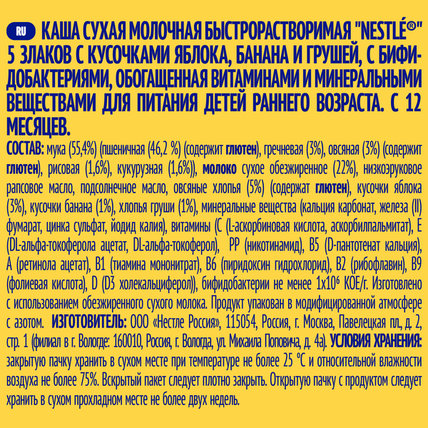 • Состав мука (55,4% %) (пшеничная (46,2 %) (содержит глютен), гречневая (3 %), овсяная (3 %) (содержит глютен), рисовая (1,6%), кукурузная (1,6%)), молоко сухое обезжиренное (22%), низкоэруковое рапсовое масло, подсолнечное масло, овсяные хлопья (5 %) (содержат глютен), кусочки яблока (3 %), кусочки банана (1%), хлопья груши (1 %), минеральные вещества (кальция карбонат, железа (II) фумарат, цинка сульфат, йодид калия), витамины (С (L- аскорбиновая кислота, аскорбилпальмитат), E (DL-альфа-токоферола ацетат, DL-альфа-токоферол), РР (никотинамид), B5 (D-пантотенат кальция), A (ретинола ацетат), В1 (тиамина мононитрат), В6 (пиридоксин гидрохлорид), В2 (рибофлавин), B9 (фолиевая кислота), D (D3 холекальциферол)), бифидобактерии не менее 1х106 КОЕ/г. Продукт упакован в модифицированной атмосфере с азотом.