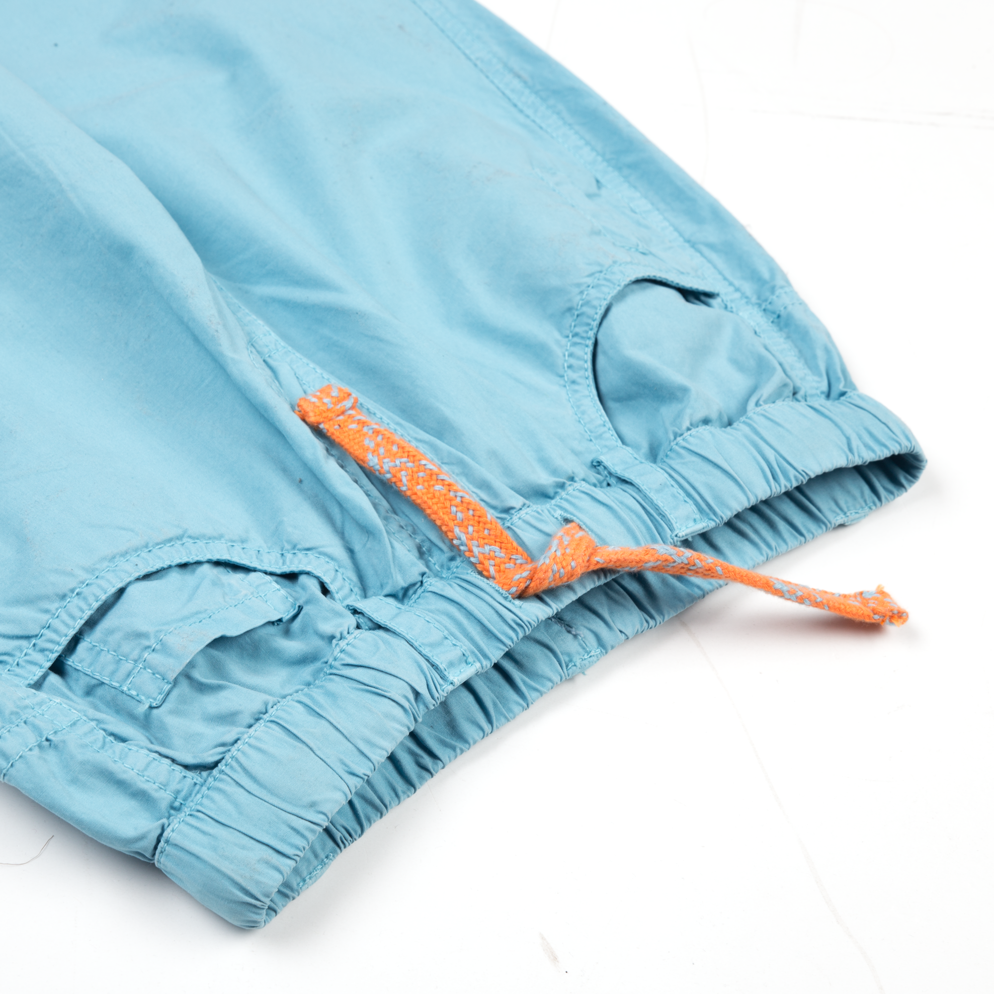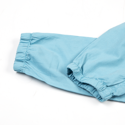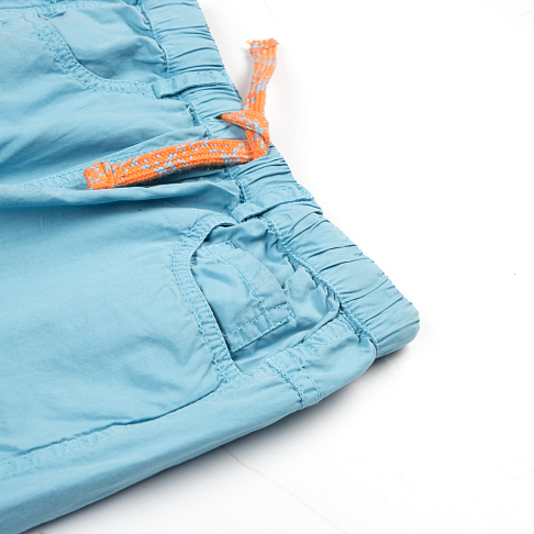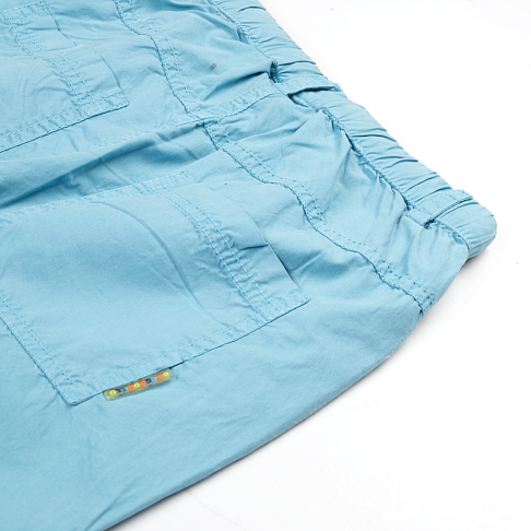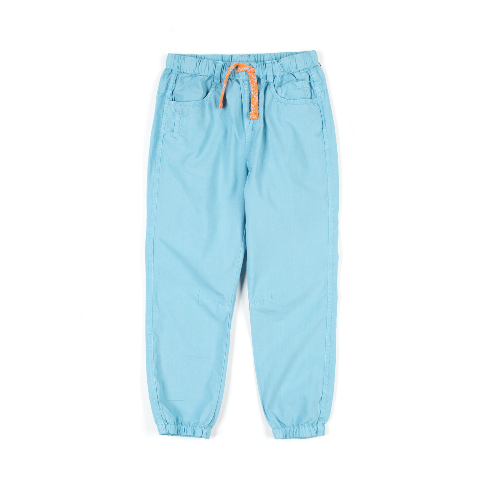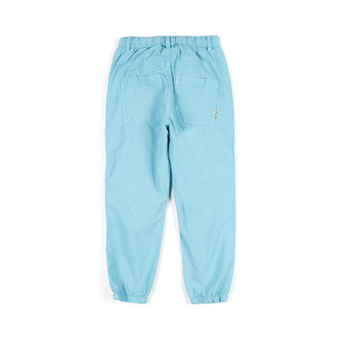 Стильные брюки светло-голубого цвета кармашками. Талия и низ штанин на удобной резиночке, обхват талии регулируется с помощью завязочек. Посадка стандартная. Брюки выполнены из натурального неаллергенного материала.