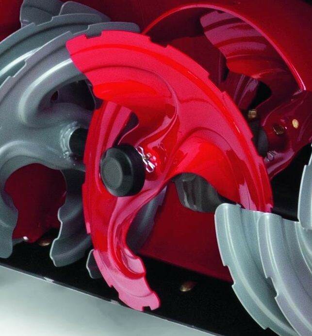 Трехступенчатая система уборки у модели EXPERT 76130 HD – инновационный продукт от компании Wolf-Garten, находящийся вне конкуренции. Суть технологии заключается в совершенно новом строении шнека. У него есть центральная часть и две боковых. Четыре боковых спирали – загребающие, а центральная – подающая. Таким образом, первая ступень уборки заключается работе боковых шнеков, которые врезаются в сугроб, загребают снег и подают его на центральную часть, скорость которой в 20 раз выше. Она напоминает вращающийся нож мясорубки, измельчает снег и лед и подает его на крыльчатку-вентилятор ( вторая ступень). Крыльчатка еще более измельчает «снежную кашу», втягивает и передает ее на желоб для выброса. Это третья, заключающая ступень Производительность работы машины возрастает на четверть, а скорость уборки на 30%. Кроме совершенно новой конструкции шнека, он еще и увеличен в размерах: проход в сугробах достигает 76 см, а высота убираемого снега - 58 см.