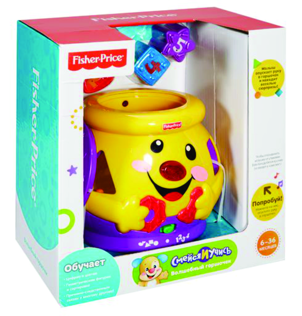 Замечательная игрушка-сортер с забавными звуками, подбадривающими фразами и музыкальными сюрпризами. Волшебный горшочек – это увлекательное обучение и настоящее веселье! У Волшебного горшочка чудесное улыбающееся личико с носиком-кнопочкой и 5 отверстий геометрической формы по бокам. При нажатии на носик раздаётся забавный звук или фраза, а в нём мигает яркая лампочка. На разноцветных кубиках - цифры от 1 до 5. Ребёнок вкладывает кубики в соответствующие по форме отверстия на горшочке. При правильном подборе фигуры звучит ободряющая фраза и весёлый музыкальный проигрыш.