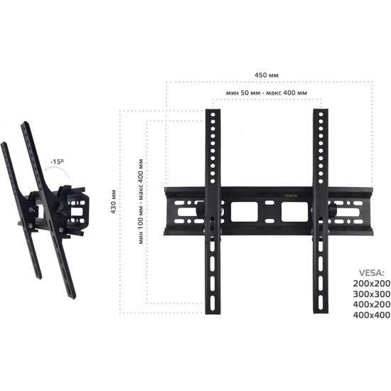 инструкция с картинками существенно упрощают процедуру установки.Особенности:Назначение для LCD- и LED-телевизоровТип кронштейна наклонныйСовместимость поддерживает ТВ с диагональю 26-55Максимальный вес ТВ 30 кг.Крепление стандарта Vesa до 400х400Типы VESA 200x200/300x300/400x200/400x400Угол наклона -5 - 15°Материал корпуса стальЦвет черныйВес 1000 гр.Размеры (ШхВхГ) 470x110x50 мм.Минимальное расстояние от стены 50 мм.Максимальное расстояние от стены 50 мм.