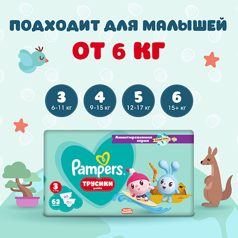 • Комфорт мирового класса с лимитированной коллекцией трусиков Pampers x Малышарики «Вокруг света». Любимые герои-Малышарики на пачке и на самих трусиках!
