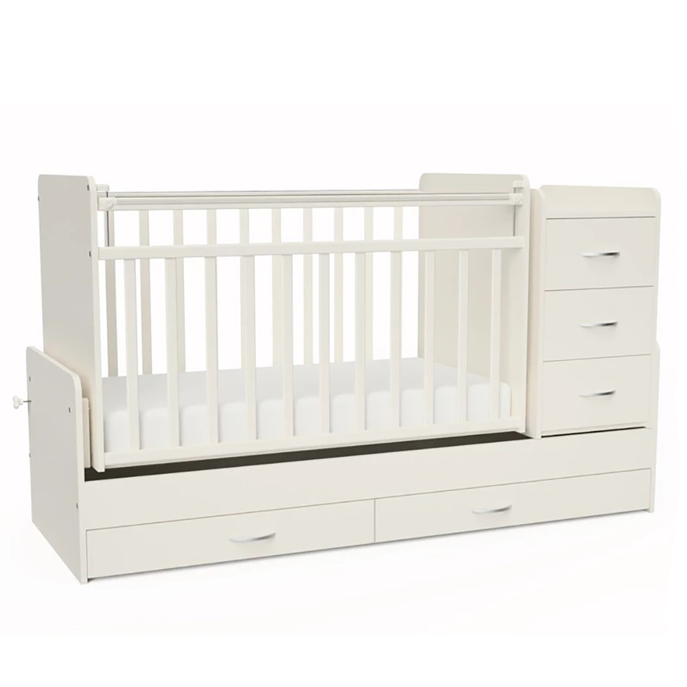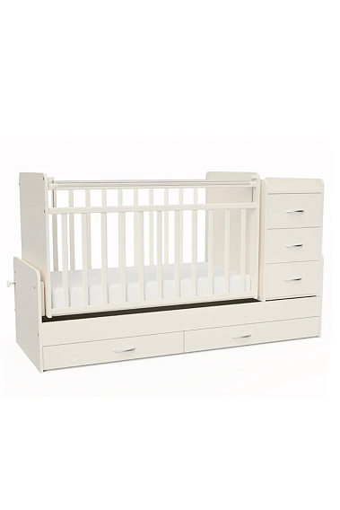 Экономичная кровать с поперечным маятниковым механизмом и вместительным ящиком для хранения. Фасады из МДФ. Пеленальный стол с ограждениями стал гораздо удобнее, за счёт увеличения размера столешницы. Комод можно установить как с правой, так и с левой стороны. Выкатной ящик на колесиках помогает избежать попадания пыли и обеспечивает возможность влажной уборки под кроватью за счёт полного выкатывания ящика.