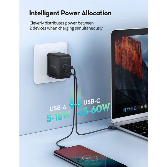 Зарядное устройство RavPower Wall Charger USB-C and USB GAN 65W Black (RP-PC133)