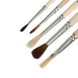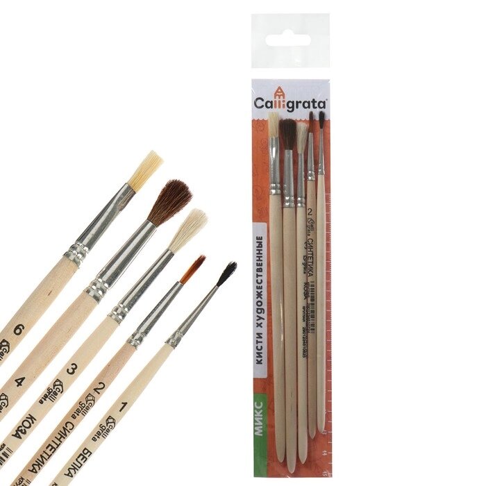 Набор кистей Микс 5 штук, Calligrata (круглые: Белка №1, Синт №2, Коза №3, Пони №4; плоская: Щетина №6), деревянная