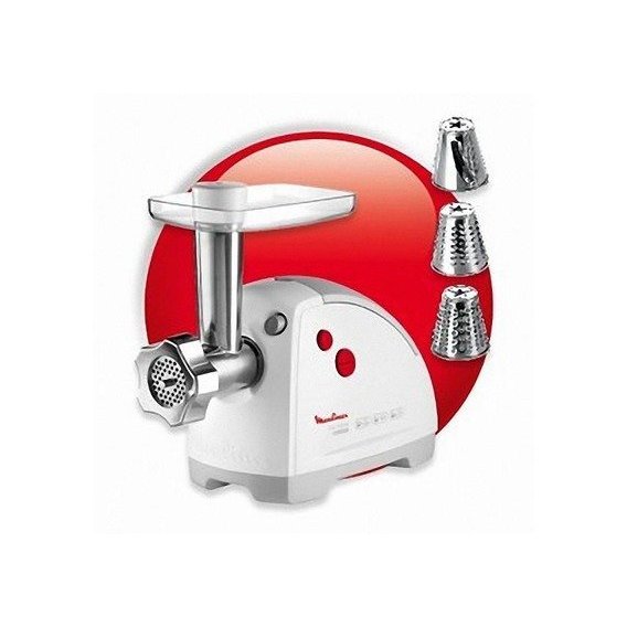 • Оснащение Прорезиненные ножки, Терка, Шинковка, Насадка для колбасок, Отсек для хранения насадок, Металлический шнек, 2 решетки для фарша, Терка, Шинковка, Овощерезка, Насадка «кеббе», Реверс